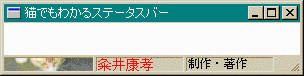 さて、問題のプロシージャ部分です。//ウィンドウプロシージャ LRESULT CALLBACK WndProc(HWND hWnd, UINT msg, WPARAM wp, LPARAM lp) { int id, st_id; HFONT hFont, hFontOld; LPDRAWITEMSTRUCT lpds; RECT rc; static HINSTANCE hInst; HBITMAP hBitmap; BITMAP bmp; HDC hdc_mem; int part_size[] = {90, 180, 270}; switch (msg) { case WM_CREATE: hInst = (HINSTANCE)GetWindowLong(hWnd, GWL_HINSTANCE); InitCommonControls(); hStatusBar = CreateWindowEx( 0, STATUSCLASSNAME, NULL, WS_CHILD | WS_VISIBLE | SBS_SIZEGRIP, 0, 0, 0, 0, hWnd, //親ウィンドウ (HMENU)ID_STATUS, hInst, NULL); //ID番号 SendMessage(hStatusBar, SB_SETPARTS, (WPARAM)3, (LPARAM)(LPINT)part_size); SendMessage(hStatusBar, SB_SETTEXT, (WPARAM)0 | SBT_OWNERDRAW, (LPARAM)(LPSTR)"MYBMP1"); SendMessage(hStatusBar, SB_SETTEXT, (WPARAM)1 | SBT_OWNERDRAW, (LPARAM)NULL); SendMessage(hStatusBar, SB_SETTEXT, (WPARAM)2 | SBT_OWNERDRAW, (LPARAM)NULL); break; case WM_DRAWITEM: lpds = (LPDRAWITEMSTRUCT)lp; st_id = lpds->CtlID; if (st_id== ID_STATUS) { switch (lpds->itemID) { case 0: hBitmap = LoadBitmap(hInst, (LPSTR)lpds->itemData); hdc_mem = CreateCompatibleDC(lpds->hDC); GetObject(hBitmap, sizeof(BITMAP), &bmp); SelectObject(hdc_mem, hBitmap); BitBlt(lpds->hDC, 0, 0, bmp.bmWidth, bmp.bmHeight, hdc_mem, 0, 0, SRCCOPY); DeleteDC(hdc_mem); DeleteObject(hBitmap); return TRUE; case 1: CopyRect((LPRECT)&rc, (LPRECT)&lpds->rcItem); hFont = SetMyFont("MS ゴシック", 14); hFontOld = (HFONT)SelectObject(lpds->hDC, hFont); SetTextColor(lpds->hDC, RGB(255, 0, 0)); SetBkMode(lpds->hDC, TRANSPARENT); TextOut(lpds->hDC, rc.left, rc.top, "粂井康孝", 8); SelectObject(lpds->hDC, hFontOld); DeleteObject(hFont); return TRUE; case 2: CopyRect((LPRECT)&rc, (LPRECT)&lpds->rcItem); hFont = SetMyFont("MS 明朝", 12); hFontOld = (HFONT)SelectObject(lpds->hDC, hFont); SetTextColor(lpds->hDC, RGB(0, 0, 0)); SetBkMode(lpds->hDC, TRANSPARENT); TextOut(lpds->hDC, rc.left, rc.top, "制作・著作", 10); SelectObject(lpds->hDC, hFontOld); DeleteObject(hFont); return TRUE; default: break; } } break; case WM_SIZE: SendMessage(hStatusBar, WM_SIZE, wp, lp); break; case WM_CLOSE: id = MessageBox(hWnd, (LPCSTR)"終了してもよいですか", (LPCSTR)"終了確認", MB_YESNO | MB_ICONQUESTION); if (id == IDYES) { DestroyWindow(hWnd); } break; case WM_DESTROY: PostQuitMessage(0); break; default: return (DefWindowProc(hWnd, msg, wp, lp)); } return 0L; }