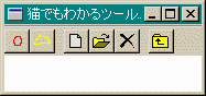 ウィンドウクラスの登録、ウィンドウの生成はいつもと同じです。//ウィンドウ・クラスの登録 BOOL InitApp(HINSTANCE hInst) { WNDCLASS wc; wc.style = CS_HREDRAW | CS_VREDRAW; wc.lpfnWndProc = WndProc; //プロシージャ名 wc.cbClsExtra = 0; wc.cbWndExtra = 0; wc.hInstance = hInst; //インスタンス wc.hIcon = LoadIcon(NULL, IDI_APPLICATION); wc.hCursor = LoadCursor(NULL, IDC_ARROW); wc.hbrBackground = (HBRUSH)GetStockObject(WHITE_BRUSH); wc.lpszMenuName = NULL; //メニュー名 wc.lpszClassName = (LPCSTR)szClassName; return (RegisterClass(&wc)); } //ウィンドウの生成 BOOL InitInstance(HINSTANCE hInst, int nCmdShow) { HWND hWnd; hWnd = CreateWindow(szClassName, "猫でもわかるツールバー",//タイトルバーにこの名前が表示されます WS_OVERLAPPEDWINDOW, //ウィンドウの種類 CW_USEDEFAULT, //X座標 CW_USEDEFAULT, //Y座標 CW_USEDEFAULT, //幅 CW_USEDEFAULT, //高さ NULL, //親ウィンドウのハンドル、親を作るときはNULL NULL, //メニューハンドル、クラスメニューを使うときはNULL hInst, //インスタンスハンドル NULL); if (!hWnd) return FALSE; ShowWindow(hWnd, nCmdShow); UpdateWindow(hWnd); return TRUE; }