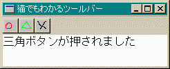 ツールバーの作成は少し長くなるので、CreateMyToolWndにまとめました。 ツールバーが押された後の処理はメニューと全く同じです。//ウィンドウプロシージャ LRESULT CALLBACK WndProc(HWND hWnd, UINT msg, WPARAM wp, LPARAM lp) { int id; static int sw; static HWND hToolWnd; enum {zero, maru, sankaku, batsu}; HDC hdc; PAINTSTRUCT ps; switch (msg) { case WM_CREATE: hToolWnd = CreateMyToolWnd(hWnd); break; case WM_SIZE: SendMessage(hToolWnd, WM_SIZE, wp, lp); break; case WM_COMMAND: switch(LOWORD(wp)) { case IDM_MARU: sw = maru; InvalidateRect(hWnd, NULL, TRUE); break; case IDM_SANKAKU: sw = sankaku; InvalidateRect(hWnd, NULL, TRUE); break; case IDM_BATSU: sw = batsu; InvalidateRect(hWnd, NULL, TRUE); break; default: return (DefWindowProc(hWnd, msg, wp, lp)); } break; case WM_PAINT: hdc = BeginPaint(hWnd, &ps); switch (sw) { case maru: TextOut(hdc, 0, 30, "丸ボタンが押されました", 22); break; case sankaku: TextOut(hdc, 0, 30, "三角ボタンが押されました", 24); break; case batsu: TextOut(hdc, 0, 30, "バツボタンが押されました", 24); break; } EndPaint(hWnd, &ps); break; case WM_CLOSE: id = MessageBox(hWnd, (LPCSTR)"終了してもよいですか", (LPCSTR)"終了確認", MB_YESNO | MB_ICONQUESTION); if (id == IDYES) { DestroyWindow(hWnd); } break; case WM_DESTROY: PostQuitMessage(0); break; default: return (DefWindowProc(hWnd, msg, wp, lp)); } return 0L; }