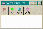 親ウィンドウが作られたらすぐに(WM_CREATE)ツールバーを作ります。//ウィンドウプロシージャ LRESULT CALLBACK WndProc(HWND hWnd, UINT msg, WPARAM wp, LPARAM lp) { int id; static HWND hToolWnd; switch (msg) { case WM_CREATE: hToolWnd = CreateMyToolWnd(hWnd); break; case WM_COMMAND: switch(LOWORD(wp)) { case IDM_KUME: MessageBox(hWnd, "「粂」ボタンを押したね", "KUME", MB_OK); break; case IDM_I: MessageBox(hWnd, "「井」ボタンを押したね", "I", MB_OK); break; case IDM_YASU: MessageBox(hWnd, "「康」ボタンを押したね", "YASU", MB_OK); break; case IDM_TAKA: MessageBox(hWnd, "「孝」ボタンを押したね", "TAKA", MB_OK); break; } break; case WM_CLOSE: id = MessageBox(hWnd, (LPCSTR)"終了してもよいですか", (LPCSTR)"終了確認", MB_YESNO | MB_ICONQUESTION); if (id == IDYES) { DestroyWindow(hWnd); } break; case WM_DESTROY: PostQuitMessage(0); break; default: return (DefWindowProc(hWnd, msg, wp, lp)); } return 0L; }