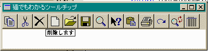 後で便利なように、グローバル変数にインスタンスハンドルを保存している ことに注意してください。 コモンコントロールを使うときの注意はいつもと同じです。// thint01.cpp #define STRICT #include <windows.h> #include <commctrl.h> #include "thint01.h" #include "resource.h" LRESULT CALLBACK WndProc(HWND, UINT, WPARAM, LPARAM); BOOL InitApp(HINSTANCE); BOOL InitInstance(HINSTANCE, int); HWND CreateMyToolWnd(HWND); char szClassName[] = "thint01"; //ウィンドウクラス HINSTANCE hInstance; TBBUTTON tbb[] = { {STD_COPY, IDM_COPY, TBSTATE_ENABLED, TBSTYLE_BUTTON, 0, 0}, {STD_CUT, IDM_CUT, TBSTATE_ENABLED, TBSTYLE_BUTTON, 0, 0}, {STD_DELETE, IDM_DELETE, TBSTATE_ENABLED, TBSTYLE_BUTTON, 0, 0}, {STD_FILENEW, IDM_NEW, TBSTATE_ENABLED, TBSTYLE_BUTTON, 0, 0}, {STD_FILEOPEN, IDM_OPEN, TBSTATE_ENABLED, TBSTYLE_BUTTON, 0, 0}, {STD_FILESAVE, IDM_SAVE, TBSTATE_ENABLED, TBSTYLE_BUTTON, 0, 0}, {STD_FIND, IDM_FIND, TBSTATE_ENABLED, TBSTYLE_BUTTON, 0, 0}, {STD_HELP, IDM_HELP, TBSTATE_ENABLED, TBSTYLE_BUTTON, 0, 0}, {STD_PASTE, IDM_PASTE, TBSTATE_ENABLED, TBSTYLE_BUTTON, 0, 0}, {STD_PRINT, IDM_PRINT, TBSTATE_ENABLED, TBSTYLE_BUTTON, 0, 0}, {STD_REDOW, IDM_REDOW, TBSTATE_ENABLED, TBSTYLE_BUTTON, 0, 0}, {STD_REPLACE, IDM_REPLACE, TBSTATE_ENABLED, TBSTYLE_BUTTON, 0, 0}, {VIEW_DETAILS, IDM_DETAILS, TBSTATE_ENABLED, TBSTYLE_BUTTON, 0, 0} }; int WINAPI WinMain(HINSTANCE hCurInst, HINSTANCE hPrevInst, LPSTR lpsCmdLine, int nCmdShow) { MSG msg; if (!hPrevInst) { if (!InitApp(hCurInst)) return FALSE; } // インスタンスをグローバル変数に保存 hInstance = hCurInst; if (!InitInstance(hCurInst, nCmdShow)) { return FALSE; } while (GetMessage(&msg, NULL, 0, 0)) { TranslateMessage(&msg); DispatchMessage(&msg); } return msg.wParam; }