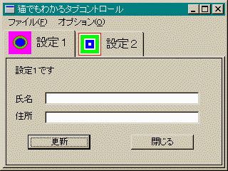 自前で作る人はIDM_ENDとIDM_SETなどを定義したヘッダーファイルを リソーススクリプトにインクルードしておいてください。 VC++のリソースエジタで作る人はソースファイルにresource.hを インクルードするのを忘れないでください。// tab04.rcの一部 // 自前で作る人はwindows.hと自作ヘッダーファイル(シンボル定義) // をインクルードしてください。 ///////////////////////////////////////////////////////////////////////////// // // Menu // MYMENU MENU DISCARDABLE BEGIN POPUP "ファイル(&F)" BEGIN MENUITEM "終了(&X)", IDM_END END POPUP "オプション(&O)" BEGIN MENUITEM "設定(&S)", IDM_SET END END ///////////////////////////////////////////////////////////////////////////// // // Bitmap // MYBMP0 BITMAP DISCARDABLE "mybmp0.bmp" MYBMP1 BITMAP DISCARDABLE "mybmp1.bmp" ///////////////////////////////////////////////////////////////////////////// // // Dialog // MYDLG0 DIALOG DISCARDABLE 0, 0, 165, 94 STYLE WS_CHILD | WS_BORDER FONT 9, "MS Pゴシック" BEGIN DEFPUSHBUTTON "更新",IDOK,17,71,50,14 PUSHBUTTON "閉じる",IDCANCEL,100,71,50,14 LTEXT "設定1です",IDC_STATIC,7,7,32,8 LTEXT "氏名",IDC_STATIC,7,34,15,8 LTEXT "住所",IDC_STATIC,7,50,15,8 EDITTEXT IDC_NAME,31,31,124,12,ES_AUTOHSCROLL EDITTEXT IDC_ADDRESS,31,49,124,12,ES_AUTOHSCROLL END MYDLG1 DIALOG DISCARDABLE 0, 0, 165, 94 STYLE WS_CHILD | WS_BORDER FONT 9, "MS Pゴシック" BEGIN DEFPUSHBUTTON "更新",IDOK,7,73,50,14 PUSHBUTTON "閉じる",IDCANCEL,112,73,50,14 LTEXT "設定2です",IDC_STATIC,7,7,32,8 END