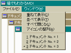 まず、WinMain関数を眺めてみると、今までと同じようでいてやはり少し違っています。 順番に違いを見ていくことにします。// mdi01.cpp #define STRICT #include <windows.h> #include "resource.h" #define IDM_FIRSTCHILD 100 LRESULT CALLBACK FrameWndProc(HWND, UINT, WPARAM, LPARAM); LRESULT CALLBACK DocProc(HWND, UINT, WPARAM, LPARAM); BOOL CALLBACK CloseAllProc(HWND, LPARAM); int MyRegisterWC(WNDPROC, LPCTSTR, HBRUSH); char szFrameClassName[] = "mdi01"; //フレームウィンドウクラス char szChildDoc[] = "document"; //ドキュメント HMENU hMenuFirst, hMenuDoc; HMENU hMenuFirstWnd, hMenuDocWnd; HINSTANCE hInst; int doc_no; int WINAPI WinMain(HINSTANCE hCurInst, HINSTANCE hPrevInst, LPSTR lpsCmdLine, int nCmdShow) { MSG msg; HWND hFrame, hClient; hInst = hCurInst; if(!MyRegisterWC(FrameWndProc, szFrameClassName,(HBRUSH)(COLOR_APPWORKSPACE + 1))) return FALSE; if(!MyRegisterWC(DocProc, szChildDoc, (HBRUSH)GetStockObject(WHITE_BRUSH))) return FALSE; hMenuFirst = LoadMenu(hInst, "MYMENU"); hMenuFirstWnd = GetSubMenu(hMenuFirst, 0); hMenuDoc = LoadMenu(hInst, "MYDOCUMENT"); hMenuDocWnd = GetSubMenu(hMenuDoc, 1); hFrame = CreateWindow( szFrameClassName, "猫でもわかるMDI", WS_OVERLAPPEDWINDOW | WS_CLIPCHILDREN, CW_USEDEFAULT, CW_USEDEFAULT, CW_USEDEFAULT, CW_USEDEFAULT, NULL, hMenuFirst, hInst, NULL); hClient = GetWindow(hFrame, GW_CHILD); ShowWindow(hFrame, nCmdShow); UpdateWindow(hFrame); while (GetMessage(&msg, NULL, 0, 0)) { if (!TranslateMDISysAccel(hClient, &msg)) { TranslateMessage(&msg); DispatchMessage(&msg); } } DestroyMenu(hMenuDoc); return msg.wParam; }