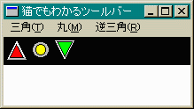 次に実際のBMPは次のようなものです。(24*24ドットに収まるようにしてあります)// custool1.rdの一部 VC++のリソースエジタを利用する場合は自動的にできるので // それを利用してください。自前で作る人は次のスクリプトを使ってください。 // 自前で作る人はwindows.hとシンボル定義のヘッダーをインクルードします。 ///////////////////////////////////////////////////////////////////////////// // // Bitmap // BTN1UP BITMAP DISCARDABLE "btn1up.bmp" BTN1DOWN BITMAP DISCARDABLE "btn1down.bmp" BTN2UP BITMAP DISCARDABLE "btn2up.bmp" BTN2DOWN BITMAP DISCARDABLE "btn2down.bmp" BTN3UP BITMAP DISCARDABLE "btn3up.bmp" BTN3DOWN BITMAP DISCARDABLE "btn3down.bmp" ///////////////////////////////////////////////////////////////////////////// // // Menu // MYMENU MENU DISCARDABLE BEGIN MENUITEM "三角(&T)", IDM_SANKAKU MENUITEM "丸(&M)", IDM_MARU MENUITEM "逆三角(&R)", IDM_R END