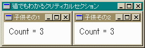 2番目のウィンドウによって作られたスレッドです。 カウントを表示している間クリティカルセクションに 入っています。void Child2(void *data) { static PDATA pdata; HDC hdc; char str[256]; char * str_org = "Count = %d"; pdata = (PDATA)data; while(pdata->th_end == 0) { EnterCriticalSection(&cs); wsprintf(str, str_org, count); hdc = GetDC(pdata->th_wnd); TextOut(hdc, 10, 10, str, strlen(str)); DeleteDC(hdc); LeaveCriticalSection(&cs); } _endthread(); return; }