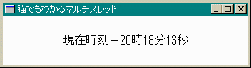スレッド関数です。DrawText関数については第5章に 簡単な解説があるので参考にしてください。DWORD Thread(LPVOID param) { PPARAM pData; HDC hdc; RECT rc; char *str_org = "現在時刻=%2d時%2d分%2d秒"; char str[256]; SYSTEMTIME st; pData = (PPARAM)param; while(!pData->bEnd) { GetLocalTime(&st); wsprintf(str, str_org, st.wHour, st.wMinute, st.wSecond); hdc = GetDC(pData->hwnd); GetClientRect(pData->hwnd, &rc); DrawText(hdc, str, lstrlen(str), &rc, DT_SINGLELINE | DT_VCENTER | DT_CENTER); ReleaseDC(pData->hwnd, hdc); Sleep(300); } return 0L; }