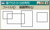// rect.rcの一部 // 自分で作る人はwindows.hとシンボル(IDM_END, IDM_START)定義の // 自作ヘッダーファイルをインクルードしてください ///////////////////////////////////////////////////////////////////////////// // // Menu // MYMENU MENU DISCARDABLE BEGIN POPUP "ファイル(&F)" BEGIN MENUITEM "終了(&X)", IDM_END END MENUITEM "描画開始(&S)", IDM_START END