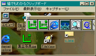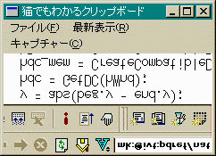 単なるメニューリソースです// clip03.rcの一部 // 自分で作る人はWindows.hと自作ヘッダーファイルのインクルードをします ///////////////////////////////////////////////////////////////////////////// // // Menu // MYMENU MENU DISCARDABLE BEGIN POPUP "ファイル(&F)" BEGIN MENUITEM "終了(&X)", IDM_END END MENUITEM "最新表示(&R)", IDM_REDRAW MENUITEM "キャプチャー(&C)", IDM_CAP END