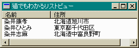 さて項目とサブ項目についてちょっとわかりにくいと思います。 ずーと上の方のサンプルの画像を見てください。 「粂井康孝」「粂井ひとみ」などの氏名は項目に相当します。 また、その氏名にたいして住所がサブ項目になるわけです。 サブ項目はListView_InsertItemマクロは使えないので ListView_SetItemマクロを使います。