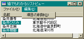 メニューから「項目の削除」(IDM_DEL)が選択されたときは ListView_GetNextItemマクロを使って選択された項目を調べ ListView_DeleteItemマクロで項目を削除しています。