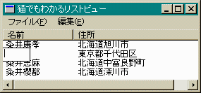 これは、初期データ表示用の関数です。 さて、前章のプログラムにこの章と同じような機能を継ぎ足してみてください。// 初期データ表示用 void SetInitialData(HWND hList) { LV_COLUMN lvcol; LV_ITEM item; lvcol.mask = LVCF_FMT | LVCF_WIDTH | LVCF_TEXT | LVCF_SUBITEM; lvcol.fmt = LVCFMT_LEFT; lvcol.cx = 100; lvcol.pszText = "名前"; lvcol.iSubItem = 0; ListView_InsertColumn(hList, 0, &lvcol); lvcol.cx = 200; lvcol.pszText = "住所"; lvcol.iSubItem = 1; ListView_InsertColumn(hList, 1, &lvcol); item.mask = LVIF_TEXT; item.pszText = "粂井康孝"; item.iItem = 0; item.iSubItem = 0; ListView_InsertItem(hList, &item); item.pszText = "北海道旭川市"; item.iItem = 0; item.iSubItem = 1; ListView_SetItem(hList, &item); item.pszText = "粂井ひとみ"; item.iItem = 1; item.iSubItem = 0; ListView_InsertItem(hList, &item); item.pszText = "東京都千代田区"; item.iItem = 1; item.iSubItem = 1; ListView_SetItem(hList, &item); item.pszText = "粂井志麻"; item.iItem = 2; item.iSubItem = 0; ListView_InsertItem(hList, &item); item.pszText = "北海道中富良野町"; item.iItem = 2; item.iSubItem = 1; ListView_SetItem(hList, &item); item.pszText = "粂井櫻都"; item.iItem = 3; item.iSubItem = 0; ListView_InsertItem(hList, &item); item.pszText = "北海道深川市"; item.iItem = 3; item.iSubItem = 1; ListView_SetItem(hList, &item); return; }
