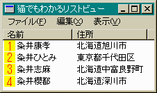 さて、できあがったプログラムをいろいろ動かしてみて不満はありませんか。 「名前」「住所」などの列の名前をクリックするとボタン様に動きます。 しかし、それだけです。これをクリックしたときその列がABC順などに 並び変わるとうれしいですね。