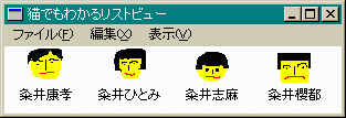 さて、イメージリストにアイコンを表示するという本題にやっと入れます。 やり方は簡単です。// 初期データ表示用 void SetInitialData(HWND hList) { LV_COLUMN lvcol; LV_ITEM item; hImage = ImageList_Create(32, 32, ILC_COLOR4, 4, 0); hSmall = ImageList_Create(16, 16, ILC_COLOR4, 4, 0); ListView_SetImageList(hList, hImage, LVSIL_NORMAL); ListView_SetImageList(hList, hSmall, LVSIL_SMALL); ImageList_AddIcon(hImage, LoadIcon(hInst, "MYICON1")); ImageList_AddIcon(hImage, LoadIcon(hInst, "MYICON2")); ImageList_AddIcon(hImage, LoadIcon(hInst, "MYICON3")); ImageList_AddIcon(hImage, LoadIcon(hInst, "MYICON4")); ImageList_AddIcon(hSmall, LoadIcon(hInst, "S1")); ImageList_AddIcon(hSmall, LoadIcon(hInst, "S2")); ImageList_AddIcon(hSmall, LoadIcon(hInst, "S3")); ImageList_AddIcon(hSmall, LoadIcon(hInst, "S4")); lvcol.mask = LVCF_FMT | LVCF_WIDTH | LVCF_TEXT | LVCF_SUBITEM; lvcol.fmt = LVCFMT_LEFT; lvcol.cx = 100; lvcol.pszText = "名前"; lvcol.iSubItem = 0; ListView_InsertColumn(hList, 0, &lvcol); lvcol.cx = 200; lvcol.pszText = "住所"; lvcol.iSubItem = 1; ListView_InsertColumn(hList, 1, &lvcol); item.mask = LVIF_TEXT | LVIF_IMAGE; item.pszText = "粂井康孝"; item.iItem = 0; item.iSubItem = 0; item.iImage = 0; ListView_InsertItem(hList, &item); item.mask = LVIF_TEXT; item.pszText = "北海道旭川市"; item.iItem = 0; item.iSubItem = 1; ListView_SetItem(hList, &item); item.mask = LVIF_TEXT | LVIF_IMAGE; item.pszText = "粂井ひとみ"; item.iItem = 1; item.iSubItem = 0; item.iImage = 1; ListView_InsertItem(hList, &item); item.mask = LVIF_TEXT; item.pszText = "東京都千代田区"; item.iItem = 1; item.iSubItem = 1; ListView_SetItem(hList, &item); item.mask = LVIF_TEXT | LVIF_IMAGE; item.pszText = "粂井志麻"; item.iItem = 2; item.iSubItem = 0; item.iImage = 2; ListView_InsertItem(hList, &item); item.mask = LVIF_TEXT; item.pszText = "北海道中富良野町"; item.iItem = 2; item.iSubItem = 1; ListView_SetItem(hList, &item); item.mask = LVIF_TEXT | LVIF_IMAGE; item.pszText = "粂井櫻都"; item.iItem = 3; item.iSubItem = 0; item.iImage = 3; ListView_InsertItem(hList, &item); item.mask = LVIF_TEXT; item.pszText = "北海道深川市"; item.iItem = 3; item.iSubItem = 1; ListView_SetItem(hList, &item); return; }