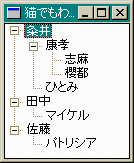 項目を挿入する関数です。項目の親子関係に注意してください。void AddItem(HWND hTree) { HTREEITEM hParent1, hParent2, hParent3, hChild1, hChild2; TV_INSERTSTRUCT tv; memset((char *)&tv, '\0', sizeof(tv)); tv.hInsertAfter = TVI_LAST; tv.item.mask = TVIF_TEXT; tv.hParent = TVI_ROOT; tv.item.pszText = "粂井"; hParent1 = TreeView_InsertItem(hTree, &tv); tv.item.pszText = "田中"; hParent2 = TreeView_InsertItem(hTree, &tv); tv.item.pszText = "佐藤"; hParent3 = TreeView_InsertItem(hTree, &tv); tv.hParent = hParent1; tv.item.pszText = "康孝"; hChild1 = TreeView_InsertItem(hTree, &tv); tv.item.pszText = "ひとみ"; hChild2 = TreeView_InsertItem(hTree, &tv); tv.hParent = hChild1; tv.item.pszText = "志麻"; TreeView_InsertItem(hTree, &tv); tv.hParent = hChild1; tv.item.pszText = "櫻都"; TreeView_InsertItem(hTree, &tv); tv.hParent = hParent2; tv.item.pszText = "マイケル"; TreeView_InsertItem(hTree, &tv); tv.hParent = hParent3; tv.item.pszText = "パトリシア"; TreeView_InsertItem(hTree, &tv); return; }
