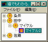 これは、前回と全く同じです。void AddItem(HWND hTree) { HTREEITEM hParent1, hParent2, hParent3, hChild1, hChild2; TV_INSERTSTRUCT tv; memset((char *)&tv, '\0', sizeof(tv)); tv.hInsertAfter = TVI_LAST; tv.item.mask = TVIF_TEXT | TVIF_IMAGE | TVIF_SELECTEDIMAGE; tv.hParent = TVI_ROOT; tv.item.pszText = "粂井"; tv.item.iImage = 1; tv.item.iSelectedImage = 0; hParent1 = TreeView_InsertItem(hTree, &tv); tv.item.pszText = "田中"; hParent2 = TreeView_InsertItem(hTree, &tv); tv.item.pszText = "佐藤"; hParent3 = TreeView_InsertItem(hTree, &tv); tv.hParent = hParent1; tv.item.pszText = "康孝"; hChild1 = TreeView_InsertItem(hTree, &tv); tv.item.pszText = "ひとみ"; hChild2 = TreeView_InsertItem(hTree, &tv); tv.hParent = hChild1; tv.item.pszText = "志麻"; TreeView_InsertItem(hTree, &tv); tv.hParent = hChild1; tv.item.pszText = "櫻都"; TreeView_InsertItem(hTree, &tv); tv.hParent = hParent2; tv.item.pszText = "マイケル"; TreeView_InsertItem(hTree, &tv); tv.hParent = hParent3; tv.item.pszText = "パトリシア"; TreeView_InsertItem(hTree, &tv); return; }