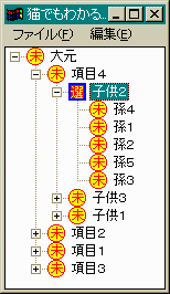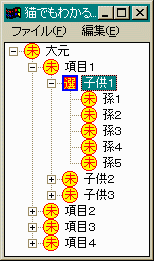 最初に表示する項目を追加する関数です。前回までと大幅に 変わっていますが特に説明は不要ですね。void AddItem(HWND hTree) { HTREEITEM hGrandParent, hParent, hChild; TV_INSERTSTRUCT tv; static char szItemName[][32] = {"項目4", "項目2", "項目1", "項目3"}; static char szChildItem[][32] = {"子供2", "子供3", "子供1"}; static char szChild2Item[][32] = {"孫4", "孫1", "孫2", "孫5", "孫3"}; int i, j, k; memset((char *)&tv, '\0', sizeof(tv)); tv.hInsertAfter = TVI_LAST; tv.item.mask = TVIF_TEXT | TVIF_IMAGE | TVIF_SELECTEDIMAGE; tv.hParent = TVI_ROOT; tv.item.pszText = "大元"; tv.item.iImage = 1; tv.item.iSelectedImage = 0; hGrandParent = TreeView_InsertItem(hTree, &tv); for (i = 0; i < 4; i++) { tv.hParent = hGrandParent; tv.item.pszText = szItemName[i]; hParent = TreeView_InsertItem(hTree, &tv); for (j = 0; j < 3; j++) { tv.hParent = hParent; tv.item.pszText = szChildItem[j]; hChild = TreeView_InsertItem(hTree, &tv); for (k = 0; k < 5; k++) { tv.hParent = hChild; tv.item.pszText = szChild2Item[k]; TreeView_InsertItem(hTree, &tv); } } } return; }