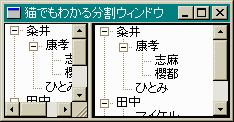 さて、中央に見える左右の区切りは左ウィンドウの右側のウィンドウ境界です。 親ウィンドウの横幅が変更になったときは左ウィンドウの幅は変化しません。 右のウィンドウの幅が変わります。(エクスプローラなどはそのように動作します) 親ウィンドウの高さが変化したら左右の子ウィンドウの高さも変化します。