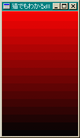 いつもに比べて何か短いですね。自作関数のInitApp, InitInsance関数の 本体がありません。また、dll02.hをインクルードしています。 プロシージャのWM_PAINTでMyDrawという自作関数を使っています。 もうお気づきのことと思いますが、前2者はいつもほとんど変わり映えせず、 後者は便利そうなのでdllにしてしまいました。このdllをWindowsの ディレクトリにコピーしておくとプログラム作りが多少楽になるかもしれません。 (実際はたいして楽にもならない)// dlltest2.cpp #define STRICT #include <windows.h> #include "dll02.h" LRESULT CALLBACK WndProc(HWND, UINT, WPARAM, LPARAM); char szClassName[] = "dlltest2"; //ウィンドウクラス int WINAPI WinMain(HINSTANCE hCurInst, HINSTANCE hPrevInst, LPSTR lpsCmdLine, int nCmdShow) { MSG msg; if (!InitApp(hCurInst, (WNDPROC)WndProc, (LPCTSTR)szClassName)) return FALSE; if (!InitInstance(hCurInst, nCmdShow, (LPCTSTR)szClassName)) return FALSE; while (GetMessage(&msg, NULL, 0, 0)) { TranslateMessage(&msg); DispatchMessage(&msg); } return msg.wParam; } //ウィンドウプロシージャ LRESULT CALLBACK WndProc(HWND hWnd, UINT msg, WPARAM wp, LPARAM lp) { int id, i, red; PAINTSTRUCT ps; HDC hdc; RECT rc; switch (msg) { case WM_PAINT: GetClientRect(hWnd, &rc); hdc = BeginPaint(hWnd, &ps); for (i = 0; i < rc.bottom; i++) { red = 255 -i; MyDraw(hdc, 0, i, rc.right, i, RGB(red, 0, 0)); if (red < 0) red = 255; } EndPaint(hWnd, &ps); break; case WM_CLOSE: id = MessageBox(hWnd, "終了してもよいですか", "終了確認", MB_YESNO | MB_ICONQUESTION); if (id == IDYES) { DestroyWindow(hWnd); } break; case WM_DESTROY: PostQuitMessage(0); break; default: return (DefWindowProc(hWnd, msg, wp, lp)); } return 0; }