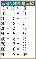 dllのTestFunc関数のアドレスをfpTestFuncに代入して//ウィンドウプロシージャ typedef int (*PTESTFUNC)(int, int); LRESULT CALLBACK WndProc(HWND hWnd, UINT msg, WPARAM wp, LPARAM lp) { int id, x, i; HINSTANCE hMyLib; PTESTFUNC fpTestFunc; char str[64]; char *str_org = "%2d + %2d = %3d"; HDC hdc; PAINTSTRUCT ps; switch (msg) { case WM_PAINT: hMyLib = LoadLibrary( "dll04.DLL"); if (hMyLib) { fpTestFunc = (PTESTFUNC)GetProcAddress(hMyLib, "TestFunc"); if(fpTestFunc == NULL) { FreeLibrary(hMyLib); return (DefWindowProc(hWnd, msg, lp, wp)); } hdc = BeginPaint(hWnd, &ps); for (i = 0; i <=9; i++) { x = (*fpTestFunc)(i * 10, i + 10); wsprintf(str, str_org, i * 10, i + 10, x); TextOut(hdc, 0, i * 20, (LPCTSTR)str, strlen(str)); } EndPaint(hWnd, &ps); } else { return (DefWindowProc(hWnd, msg, lp, wp)); } FreeLibrary(hMyLib); break; case WM_CLOSE: id = MessageBox(hWnd, "終了してもよいですか", "終了確認", MB_YESNO | MB_ICONQUESTION); if (id == IDYES) { DestroyWindow(hWnd); } break; case WM_DESTROY: PostQuitMessage(0); break; default: return (DefWindowProc(hWnd, msg, wp, lp)); } return 0L; }