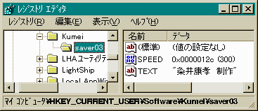 また、サブキーの名前は"Software\\Kumei\\saver03"というように ディレクトリを指定するのと同じ方法です。(「\」記号は2つずつ つけます。そうしないと\saver03があると「\s」というエスケープシーケンスと 区別が付かなくなるからです。この手の話はC言語の参考書の最初の方に出ています)