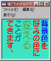 今回は背景色を変えるRTF_BackColor関数が新たに増えました。// rich10.cpp #define STRICT #include <windows.h> #include <richedit.h> #include "resource.h" LRESULT CALLBACK WndProc(HWND, UINT, WPARAM, LPARAM); DWORD CALLBACK MySaveProc(DWORD, LPBYTE, LONG, LONG *); DWORD CALLBACK MyReadProc(DWORD, LPBYTE, LONG, LONG *); BOOL InitApp(HINSTANCE); BOOL InitInstance(HINSTANCE, int); BOOL SetInitialFont(HWND hWnd); BOOL SetMyFont(HWND); BOOL SetCenter(HWND); BOOL SetLeft(HWND); BOOL SetRight(HWND); void ClearCheck(HMENU);//段落書式のチェックをはずす void RTF_Save(HWND); void RTF_SaveAs(HWND); void RTF_Open(HWND); void RTF_CheckMenu(HWND, HMENU); void RTF_Print(HWND); void RTF_All(HWND); HDC GetPrintInfo(void); int PrinterSet(HWND); int RTF_AddPageNo(HDC, int); void RTF_SetWYSIWYG(HWND); void RTF_New(HWND); void RTF_Vertical(HWND); void RTF_Horizontal(HWND); void RTF_BackColor(HWND); char szClassName[] = "rich10"; //ウィンドウクラス HINSTANCE hInst; DWORD dwMyMask; //CHARFORMATで使うマスク値 char szFName[MAX_PATH]; int nFileType = 1; //1:RTF 2:TXT 3:All char *szAppTitle = "猫でもわかるRTF"; PRINTER_INFO_5 prninfo[3];