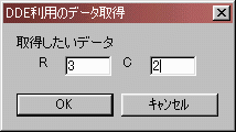 ありふれたリソース・スクリプトです。「キャンセル」は 実際には半角かなです。// dde01.rcの一部 ///////////////////////////////////////////////////////////////////////////// // // Menu // MYMENU MENU DISCARDABLE BEGIN POPUP "ファイル(&F)" BEGIN MENUITEM "終了(&X)", IDM_END END POPUP "DDE(&D)" BEGIN MENUITEM "DDE開始(&S)", IDM_START MENUITEM "DDE終了(&E)", IDM_STOP MENUITEM "データの取得(&G)", IDM_GETDATA END END ///////////////////////////////////////////////////////////////////////////// // // Dialog // MYDLG DIALOG DISCARDABLE 0, 0, 119, 63 STYLE DS_MODALFRAME | WS_POPUP | WS_CAPTION | WS_SYSMENU CAPTION "DDE利用のデータ取得" FONT 9, "MS Pゴシック" BEGIN DEFPUSHBUTTON "OK",IDOK,7,42,50,14 PUSHBUTTON "キャンセル",IDCANCEL,61,42,50,14 LTEXT "取得したいデータ",IDC_STATIC,7,7,51,8 EDITTEXT IDC_EDIT1,32,19,24,12,ES_AUTOHSCROLL LTEXT "R",IDC_STATIC,18,19,8,8 LTEXT "C",IDC_STATIC,62,19,8,8 EDITTEXT IDC_EDIT2,76,19,24,12,ES_AUTOHSCROLL END