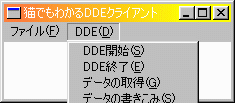 メニューとダイアログボックスのリソース・スクリプトです。 特に説明は不要ですね。// ddecl01.rcの一部 ///////////////////////////////////////////////////////////////////////////// // // Menu // MYMENU MENU DISCARDABLE BEGIN POPUP "ファイル(&F)" BEGIN MENUITEM "終了(&X)", IDM_END END POPUP "DDE(&D)" BEGIN MENUITEM "DDE開始(&S)", IDM_START MENUITEM "DDE終了(&E)", IDM_STOP MENUITEM "データの取得(&G)", IDM_GETDATA MENUITEM "データの書きこみ(&S)", IDM_SETDATA END END ///////////////////////////////////////////////////////////////////////////// // // Dialog // SETDATA DIALOG DISCARDABLE 0, 0, 119, 63 STYLE DS_MODALFRAME | WS_POPUP | WS_CAPTION | WS_SYSMENU CAPTION "データの書きこみ" FONT 9, "MS Pゴシック" BEGIN DEFPUSHBUTTON "OK",IDOK,7,42,50,14 PUSHBUTTON "キャンセル",IDCANCEL,63,42,50,14 LTEXT "書きこむデータ",IDC_STATIC,7,7,45,8 EDITTEXT IDC_EDIT1,7,19,96,14,ES_AUTOHSCROLL END