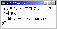 いつもと同じです。ウィンドウの大きさを適当な大きさにしています。//ウィンドウの生成 BOOL InitInstance(HINSTANCE hInst, int nCmdShow) { HWND hWnd; hWnd = CreateWindow(szClassName, "猫でもわかるアトム",//タイトルバーにこの名前が表示されます WS_OVERLAPPEDWINDOW, //ウィンドウの種類 CW_USEDEFAULT, //X座標 CW_USEDEFAULT, //Y座標 240, //幅 122, //高さ NULL, //親ウィンドウのハンドル、親を作るときはNULL NULL, //メニューハンドル、クラスメニューを使うときはNULL hInst, //インスタンスハンドル NULL); if (!hWnd) return FALSE; ShowWindow(hWnd, nCmdShow); UpdateWindow(hWnd); return TRUE; }