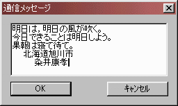 メニューから「送信」(IDM_SEND)が選ばれたら、ダイアログボックスを 出すようにしています。他はいつもと同じです。LRESULT CALLBACK WndProc(HWND hWnd, UINT msg, WPARAM wp, LPARAM lp) { int id; switch (msg) { case WM_COMMAND: switch (LOWORD(wp)) { case IDM_END: SendMessage(hWnd, WM_CLOSE, 0, 0); break; case IDM_SEND: DialogBox(hInst, "MYDLG", hWnd, (DLGPROC)MyDlgProc); break; } break; case WM_CLOSE: id = MessageBox(hWnd, "終了してもよいですか", "終了確認", MB_YESNO | MB_ICONQUESTION); if (id == IDYES) { DestroyWindow(hWnd); } break; case WM_DESTROY: PostQuitMessage(0); break; default: return (DefWindowProc(hWnd, msg, wp, lp)); } return 0; }