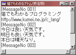 さて、送信側からWM_MYMSGが来たらWPARAMを調べてこれを aMyAtomにコピーします(送信側でWPARAMにアトムを指定したので)。 あとは、GlobalGetAtomNameで文字列を取得してエディットコントロールに 表示するだけです。
