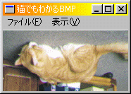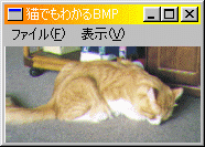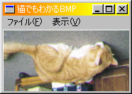 ここは、いつもと同じです。int WINAPI WinMain(HINSTANCE hCurInst, HINSTANCE hPrevInst, LPSTR lpsCmdLine, int nCmdShow) { MSG msg; if (!InitApp(hCurInst)) return FALSE; if (!InitInstance(hCurInst, nCmdShow)) return FALSE; while (GetMessage(&msg, NULL, 0, 0)) { TranslateMessage(&msg); DispatchMessage(&msg); } return msg.wParam; } //ウィンドウ・クラスの登録 ATOM InitApp(HINSTANCE hInst) { WNDCLASSEX wc; wc.cbSize = sizeof(WNDCLASSEX); wc.style = CS_HREDRAW | CS_VREDRAW; wc.lpfnWndProc = WndProc; //プロシージャ名 wc.cbClsExtra = 0; wc.cbWndExtra = 0; wc.hInstance = hInst; //インスタンス wc.hIcon = LoadIcon(NULL, IDI_APPLICATION); wc.hCursor = LoadCursor(NULL, IDC_ARROW); wc.hbrBackground = (HBRUSH)GetStockObject(WHITE_BRUSH); wc.lpszMenuName = "MYMENU"; //メニュー名 wc.lpszClassName = (LPCSTR)szClassName; wc.hIconSm = LoadIcon(NULL, IDI_APPLICATION); return (RegisterClassEx(&wc)); } //ウィンドウの生成 BOOL InitInstance(HINSTANCE hInst, int nCmdShow) { HWND hWnd; hWnd = CreateWindow(szClassName, "猫でもわかるBMP",//タイトルバーにこの名前が表示されます WS_OVERLAPPEDWINDOW,//ウィンドウの種類 CW_USEDEFAULT, //X座標 CW_USEDEFAULT, //Y座標 CW_USEDEFAULT, //幅 CW_USEDEFAULT, //高さ NULL, //親ウィンドウのハンドル、親を作るときはNULL NULL, //メニューハンドル、クラスメニューを使うときはNULL hInst, //インスタンスハンドル NULL); if (!hWnd) return FALSE; ShowWindow(hWnd, nCmdShow); UpdateWindow(hWnd); return TRUE; }