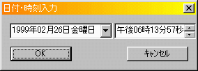 まず、リソース・エディタで「OK」「キャンセル」ボタンだけが 存在するダイアログボックスのテンプレートを作ります。 そしてダイアログボックスのプロシージャでWM_INITDIALOG メッセージが来たら、CreateWindowExでコントロールを作ります。 この時ウィンドウスタイルにDTS_LONGDATEFORMATを指定すると 日付の、DTS_TIMEFORMATを指定すると時刻のコントロールとなります。 他にも、いろいろなウィンドウスタイルがありますが必要に応じて その都度解説します。さて、このコントロールでユーザーの入力した 日付・時刻を取得するにはGetWindowText関数 (第20章)で行えます。