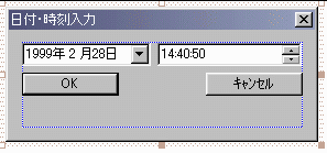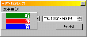 今回はDialogのリソース・スクリプトにDTPが組み込まれていることに注意して下さい。// newctl02.rcの一部 ///////////////////////////////////////////////////////////////////////////// // // Menu // MYMENU MENU DISCARDABLE BEGIN POPUP "ファイル(&F)" BEGIN MENUITEM "終了(&X)", IDM_END END MENUITEM "入力(&T)", IDM_INPUT END ///////////////////////////////////////////////////////////////////////////// // // Dialog // MYDLG DIALOG DISCARDABLE 0, 0, 159, 65 STYLE DS_MODALFRAME | WS_POPUP | WS_CAPTION | WS_SYSMENU CAPTION "日付・時刻入力" FONT 9, "MS Pゴシック" BEGIN DEFPUSHBUTTON "OK",IDOK,7,25,50,14 PUSHBUTTON "キャンセル",IDCANCEL,102,25,50,14 CONTROL "DateTimePicker1",IDC_DATETIMEPICKER1,"SysDateTimePick32", DTS_RIGHTALIGN | DTS_LONGDATEFORMAT | WS_TABSTOP,7,7,67, 14 CONTROL "DateTimePicker2",IDC_DATETIMEPICKER2,"SysDateTimePick32", DTS_RIGHTALIGN | DTS_UPDOWN | WS_TABSTOP | 0x8,77,7,75, 14 END ///////////////////////////////////////////////////////////////////////////// // // Bitmap // BLUE BITMAP DISCARDABLE "blue.bmp" RED BITMAP DISCARDABLE "red.bmp" GREEN BITMAP DISCARDABLE "green.bmp"