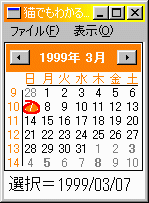 ごく普通のメニューです。これは、初期メニューで プログラム中でメニュー項目、IDなどが変更されます。// newctl04.rcの一部 ///////////////////////////////////////////////////////////////////////////// // // Menu // MYMENU MENU DISCARDABLE BEGIN POPUP "ファイル(&F)" BEGIN MENUITEM "終了(&X)", IDM_END END POPUP "表示(&O)" BEGIN MENUITEM "週数を表示(&W)", IDM_WEEKNO MENUITEM "本日を表示しない(&T)", IDM_NOTODAY END END