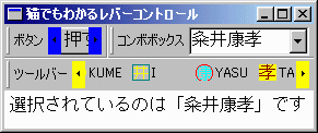 このへんはいつもと同じです。// rebar04.cpp #ifndef STRICT #define STRICT #endif #include <windows.h> #include <commctrl.h> #include "resource.h" #define ID_BUT1 100 #define ID_COMBO 101 #define ID_TOOLBAR 102 LRESULT CALLBACK WndProc(HWND, UINT, WPARAM, LPARAM); ATOM InitApp(HINSTANCE); BOOL InitInstance(HINSTANCE, int); HWND MakeMyRebar(HWND); HWND MakeMyCombo(HWND); HWND MakeMyTool(HWND); void SetMyStrings(HWND); char szClassName[] = "rebar04"; //ウィンドウクラス HINSTANCE hInst; TBBUTTON tb[] = { {0, IDM_KUME, TBSTATE_ENABLED, TBSTYLE_BUTTON, 0, 0, 0}, {1, IDM_I, TBSTATE_ENABLED , TBSTYLE_BUTTON, 0, 0, 0}, {2, IDM_YASU, TBSTATE_ENABLED, TBSTYLE_BUTTON, 0, 0, 0}, {3, IDM_TAKA, TBSTATE_ENABLED, TBSTYLE_BUTTON, 0, 0, 0} }; int WINAPI WinMain(HINSTANCE hCurInst, HINSTANCE hPrevInst, LPSTR lpsCmdLine, int nCmdShow) { MSG msg; hInst = hCurInst; if (!InitApp(hCurInst)) return FALSE; if (!InitInstance(hCurInst, nCmdShow)) return FALSE; while (GetMessage(&msg, NULL, 0, 0)) { TranslateMessage(&msg); DispatchMessage(&msg); } return msg.wParam; } //ウィンドウ・クラスの登録 ATOM InitApp(HINSTANCE hInst) { WNDCLASSEX wc; wc.cbSize = sizeof(WNDCLASSEX); wc.style = CS_HREDRAW | CS_VREDRAW; wc.lpfnWndProc = WndProc; //プロシージャ名 wc.cbClsExtra = 0; wc.cbWndExtra = 0; wc.hInstance = hInst;//インスタンス wc.hIcon = LoadIcon(NULL, IDI_APPLICATION); wc.hCursor = LoadCursor(NULL, IDC_ARROW); wc.hbrBackground = (HBRUSH)GetStockObject(WHITE_BRUSH); wc.lpszMenuName = NULL; //メニュー名 wc.lpszClassName = (LPCSTR)szClassName; wc.hIconSm = LoadIcon(NULL, IDI_APPLICATION); return (RegisterClassEx(&wc)); } //ウィンドウの生成 BOOL InitInstance(HINSTANCE hInst, int nCmdShow) { HWND hWnd; hWnd = CreateWindow(szClassName, "猫でもわかるレバーコントロール", //タイトルバーにこの名前が表示されます WS_OVERLAPPEDWINDOW, //ウィンドウの種類 CW_USEDEFAULT, //X座標 CW_USEDEFAULT, //Y座標 320, //幅 150, //高さ NULL, //親ウィンドウのハンドル、親を作るときはNULL NULL, //メニューハンドル、クラスメニューを使うときはNULL hInst, //インスタンスハンドル NULL); if (!hWnd) return FALSE; ShowWindow(hWnd, nCmdShow); UpdateWindow(hWnd); return TRUE; }