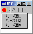 メニューの第1階層は表示されない点に注意して下さい。// newtool2.rcの一部 ///////////////////////////////////////////////////////////////////////////// // // Toolbar // IDR_TOOLBAR2 TOOLBAR DISCARDABLE 16, 15 BEGIN BUTTON IDM_MARU BUTTON IDM_SANKAKU BUTTON IDM_SHIKAKU END IDR_TOOLBAR1 TOOLBAR DISCARDABLE 16, 15 BEGIN BUTTON IDM_MARU BUTTON IDM_SANKAKU BUTTON IDM_SHIKAKU END ///////////////////////////////////////////////////////////////////////////// // // Bitmap // IDR_TOOLBAR2 BITMAP DISCARDABLE "toolbar2.bmp" IDR_TOOLBAR1 BITMAP DISCARDABLE "toolbar1.bmp" ///////////////////////////////////////////////////////////////////////////// // // Menu // MARUMENU MENU DISCARDABLE BEGIN POPUP "ダミーです" BEGIN MENUITEM "丸−項目&1", IDM_RND1 MENUITEM "丸−項目&2", IDM_RND2 MENUITEM "丸−項目&3", IDM_RND3 END END SHIKAKUMENU MENU DISCARDABLE BEGIN POPUP "ダミーです" BEGIN MENUITEM "四角−項目&1", IDM_RCT1 MENUITEM "四角−項目&2", IDM_RCT2 END END