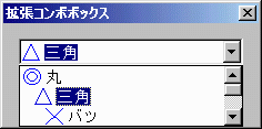 拡張コンボボックスにアイテムを挿入する関数です。 特に説明は不要ですね。void SetMyComboEx(HWND hCombo) { COMBOBOXEXITEM ci; memset(&ci, 0, sizeof(COMBOBOXEXITEM)); ci.mask = CBEIF_TEXT | CBEIF_IMAGE | CBEIF_SELECTEDIMAGE | CBEIF_INDENT; ci.pszText = "丸"; ci.iItem = 0; ci.iIndent = 0; ci.iImage = 0; ci.iSelectedImage = 0; SendMessage(hCombo, CBEM_INSERTITEM, 0, (LPARAM)&ci); ci.pszText = "三角"; ci.iItem = 1; ci.iIndent = 1; ci.iImage = 1; ci.iSelectedImage = 1; SendMessage(hCombo, CBEM_INSERTITEM, 0, (LPARAM)&ci); ci.pszText = "バツ"; ci.iItem = 2; ci.iIndent = 2; ci.iImage = 2; ci.iSelectedImage = 2; SendMessage(hCombo, CBEM_INSERTITEM, 0, (LPARAM)&ci); ci.pszText = "丸2"; ci.iItem = 3; ci.iIndent = 0; ci.iImage = 0; ci.iSelectedImage = 0; SendMessage(hCombo, CBEM_INSERTITEM, 0, (LPARAM)&ci); ci.pszText = "三角2"; ci.iItem = 4; ci.iIndent = 1; ci.iImage = 1; ci.iSelectedImage = 1; SendMessage(hCombo, CBEM_INSERTITEM, 0, (LPARAM)&ci); ci.pszText = "バツ2"; ci.iItem = 5; ci.iIndent = 2; ci.iImage = 2; ci.iSelectedImage = 2; SendMessage(hCombo, CBEM_INSERTITEM, 0, (LPARAM)&ci); return; }