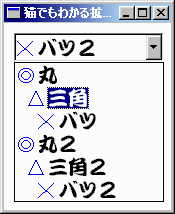 今回はプログラムを簡略化するため親ウィンドウ(メインウィンドウ)のクライアント 領域に直接拡張コンボボックスを表示しています。//ウィンドウプロシージャ LRESULT CALLBACK WndProc(HWND hWnd, UINT msg, WPARAM wp, LPARAM lp) { int id; INITCOMMONCONTROLSEX ic; static HWND hCombo; static HFONT hFont; static HIMAGELIST hImg; LPNMHDR lpn; PNMCOMBOBOXEX pncombo; switch (msg) { case WM_CREATE: ic.dwSize = sizeof(INITCOMMONCONTROLSEX); ic.dwICC = ICC_USEREX_CLASSES; InitCommonControlsEx(&ic); hCombo = CreateWindowEx(0, WC_COMBOBOXEX, "", WS_CHILD | WS_VISIBLE | CBS_DROPDOWNLIST, 10, 10, 150, 200, hWnd, (HMENU)ID_COMBO, hInst, NULL); hFont = CreateFont(20, 0, 0, 0, FW_NORMAL, FALSE, FALSE, 0, SHIFTJIS_CHARSET, OUT_DEFAULT_PRECIS, CLIP_DEFAULT_PRECIS, DEFAULT_QUALITY, DEFAULT_PITCH, "DF勘亭流"); SendMessage(hCombo, WM_SETFONT, (WPARAM)hFont, 0); hImg = ImageList_LoadBitmap(hInst, "MYBMP", 16, 15, RGB(255, 0, 0)); SendMessage(hCombo, CBEM_SETIMAGELIST, 0, (LPARAM)hImg); SetMyComboEx(hCombo); break; case WM_NOTIFY: lpn = (LPNMHDR)lp; if (lpn->hwndFrom == hCombo && lpn->code == CBEN_GETDISPINFO) { pncombo = (PNMCOMBOBOXEX)lp; pncombo->ceItem.mask |= CBEIF_DI_SETITEM; //MessageBox(hWnd, "CBEN_GETDISPINFOが来た", "OK", MB_OK); //ここでMessageBoxを実行すると最初にコンボボックスを開く時のみ //アイテムの数だけメッセージボックスが出てくる //その後は出てこない。もしCBEIF_DI_SETITEMを設定しないと //ずっとメッセージボックスが出てドロップダウンメニューを開けない switch (pncombo->ceItem.iItem) { case 0: pncombo->ceItem.pszText = "丸"; pncombo->ceItem.iImage = 0; pncombo->ceItem.iSelectedImage = 0; pncombo->ceItem.iIndent = 0; break; case 1: pncombo->ceItem.pszText = "三角"; pncombo->ceItem.iImage = 1; pncombo->ceItem.iSelectedImage = 1; pncombo->ceItem.iIndent = 1; break; case 2: pncombo->ceItem.pszText = "バツ"; pncombo->ceItem.iImage = 2; pncombo->ceItem.iSelectedImage = 2; pncombo->ceItem.iIndent = 2; break; case 3: pncombo->ceItem.pszText = "丸2"; pncombo->ceItem.iImage = 0; pncombo->ceItem.iSelectedImage = 0; pncombo->ceItem.iIndent = 0; break; case 4: pncombo->ceItem.pszText = "三角2"; pncombo->ceItem.iImage = 1; pncombo->ceItem.iSelectedImage = 1; pncombo->ceItem.iIndent = 1; break; case 5: pncombo->ceItem.pszText = "バツ2"; pncombo->ceItem.iImage = 2; pncombo->ceItem.iSelectedImage = 2; pncombo->ceItem.iIndent = 2; break; } } else return DefWindowProc(hWnd, msg, wp,lp); break; case WM_CLOSE: id = MessageBox(hWnd, "終了してもよいですか", "終了確認", MB_YESNO | MB_ICONQUESTION); if (id == IDYES) { DeleteObject(hFont); ImageList_Destroy(hImg); DestroyWindow(hCombo); DestroyWindow(hWnd); } break; case WM_DESTROY: PostQuitMessage(0); break; default: return (DefWindowProc(hWnd, msg, wp, lp)); } return 0; }