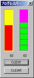 新しいプログレスバーのスタイルPBS_VERTICAL, PBS_SMOOTHに注意して下さい。 実際にはリソース・エディタでプログレスバーのプロパティの「垂直方向」「スムーズ」 にチェックをつけるだけです。// newprog01.rcの一部 ///////////////////////////////////////////////////////////////////////////// // // Menu // MYMENU MENU DISCARDABLE BEGIN POPUP "ファイル(&F)" BEGIN MENUITEM "終了(&X)", IDM_END END POPUP "オプション(&O)" BEGIN MENUITEM "プログレスバーを出す(&P)", IDM_PROG END END ///////////////////////////////////////////////////////////////////////////// // // Dialog // MYDLG DIALOGEX 0, 0, 66, 165 STYLE DS_MODALFRAME | DS_CENTER | WS_POPUP | WS_CAPTION | WS_SYSMENU CAPTION "プログレスバー" FONT 9, "MS Pゴシック" BEGIN DEFPUSHBUTTON "CLICK!",IDOK,7,124,50,14 PUSHBUTTON "CLEAR",IDC_CLEAR,7,143,50,14 CONTROL "Progress1",IDC_PROGRESS1,"msctls_progress32", PBS_VERTICAL | PBS_SMOOTH | WS_BORDER,7,7,18,97 CONTROL "Progress2",IDC_PROGRESS2,"msctls_progress32", PBS_VERTICAL | WS_BORDER,38,7,18,97 LTEXT "Static",IDC_STATIC1,7,111,19,10,0,WS_EX_RIGHT LTEXT "Static",IDC_STATIC2,34,111,19,10,0,WS_EX_RIGHT END