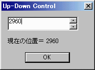 CreateUpdownControl関数でアップダウンコントロールを作る時と比較してみてください。 格段に簡単になっていると思われます。//updwn02.rcの一部 ///////////////////////////////////////////////////////////////////////////// // // Menu // MYMENU MENU DISCARDABLE BEGIN POPUP "ファイル(&F)" BEGIN MENUITEM "終了(&X)", IDM_END END POPUP "オプション(&O)" BEGIN MENUITEM "ダイアログを出す(&D)", IDM_DLG END END ///////////////////////////////////////////////////////////////////////////// // // Dialog // MYDLG DIALOG DISCARDABLE 0, 0, 103, 75 STYLE DS_MODALFRAME | DS_CENTER | WS_POPUP | WS_CAPTION | WS_SYSMENU CAPTION "Up-Down Control" FONT 9, "MS Pゴシック" BEGIN DEFPUSHBUTTON "OK",IDOK,26,54,50,14 EDITTEXT IDC_EDIT1,7,7,79,18,ES_AUTOHSCROLL CONTROL "Spin1",IDC_SPIN1,"msctls_updown32",UDS_WRAP | UDS_SETBUDDYINT | UDS_ALIGNRIGHT | UDS_ARROWKEYS | UDS_NOTHOUSANDS,86,7,9,18 LTEXT "現在の位置=",IDC_STATIC,7,35,42,8 LTEXT "",IDC_STATIC1,50,35,36,8 END