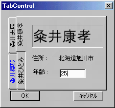 リソースエディタでダイアログ中のコントロールの配置を決めると 上のようなスクリプトができあがります。// newtab02.rcの一部 ///////////////////////////////////////////////////////////////////////////// // // Menu // MYMENU MENU DISCARDABLE BEGIN POPUP "ファイル(&F)" BEGIN MENUITEM "終了(&X)", IDM_END END POPUP "ダイアログ(&D)" BEGIN MENUITEM "ダイアログボックス(&T)", IDM_TAB END END ///////////////////////////////////////////////////////////////////////////// // // Dialog // MYDLG DIALOG DISCARDABLE 0, 0, 131, 131 STYLE DS_MODALFRAME | DS_CENTER | WS_POPUP | WS_CAPTION | WS_SYSMENU CAPTION "TabControl" FONT 9, "MS Pゴシック" BEGIN DEFPUSHBUTTON "OK",IDOK,10,110,35,14 PUSHBUTTON "キャンセル",IDCANCEL,84,110,35,14 LTEXT "test",IDC_STATIC1,36,19,83,31,SS_CENTERIMAGE | SS_SUNKEN LTEXT "Static",IDC_STATIC2,67,61,51,12 EDITTEXT IDC_EDIT1,68,80,30,12,ES_AUTOHSCROLL LTEXT "年齢 :",IDC_STATIC,37,80,18,8 LTEXT "住所 :",IDC_STATIC,36,61,18,8 CONTROL "Tab1",IDC_TAB1,"SysTabControl32",TCS_HOTTRACK | TCS_VERTICAL,7,7,116,102 END