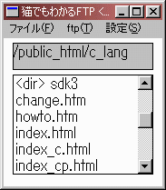さて、このプログラムでいろいろなサーバーに接続してみると、 「..」「.」のディレクトリを表示するものと、そうでないものがあることが わかります。「..」のディレクトリを表示している場合は これをダブルクリックするとひとつ上のディレクトリに移動できます。