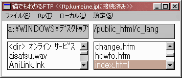 左側にローカルのディレクトリ、右側にFTPサーバのディレクトリが