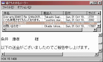 一方リストビューの「件名」がクリックされたら(当然通知メッセージを捕まえます)、 POP3に接続して、クリックされた アイテム番号を取得して、「RETR」コマンドを送ります。 内容をエディットコントロールに表示したら接続を切ります。