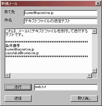 テキストファイルを送信する場合、メーラーによっては テキストファイルの内容を本文中に展開してしまうものもあります。 これがいやなときは付加的説明に