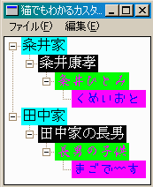 親ウィンドウのプロシージャです。//ウィンドウプロシージャ LRESULT CALLBACK WndProc(HWND hWnd, UINT msg, WPARAM wp, LPARAM lp) { int id; static HWND hTree; INITCOMMONCONTROLSEX ic; static HINSTANCE hInst; HTREEITEM hItem, hNewItem; TVINSERTSTRUCT ti; char szName[ITEMNAME_SIZE]; LPNMHDR lpnmhdr; LPNMTVCUSTOMDRAW lpnmcd; static HFONT hFont1, hFont2, hFont3, hFont4, hOrgFont; switch (msg) { case WM_CREATE: hInst = ((LPCREATESTRUCT)lp)->hInstance; ic.dwSize = sizeof(INITCOMMONCONTROLSEX); ic.dwICC = ICC_TREEVIEW_CLASSES; InitCommonControlsEx(&ic); hTree = MakeMyTree(hWnd); hOrgFont = CreateFont(16, 8, 0, 0, FW_NORMAL, FALSE, FALSE, 0, SHIFTJIS_CHARSET, OUT_DEFAULT_PRECIS, CLIP_DEFAULT_PRECIS, DEFAULT_QUALITY, DEFAULT_PITCH, "system"); hFont1 = CreateFont(16, 8, 0, 0, FW_NORMAL, FALSE, FALSE, 0, SHIFTJIS_CHARSET, OUT_DEFAULT_PRECIS, CLIP_DEFAULT_PRECIS, DEFAULT_QUALITY, DEFAULT_PITCH, "MS ゴシック"); hFont2 = CreateFont(16, 8, 0, 0, FW_NORMAL, FALSE, FALSE, 0, SHIFTJIS_CHARSET, OUT_DEFAULT_PRECIS, CLIP_DEFAULT_PRECIS, DEFAULT_QUALITY, DEFAULT_PITCH, "MS 明朝"); hFont3 = CreateFont(16, 8, 0, 0, FW_NORMAL, FALSE, FALSE, 0, SHIFTJIS_CHARSET, OUT_DEFAULT_PRECIS, CLIP_DEFAULT_PRECIS, DEFAULT_QUALITY, DEFAULT_PITCH, "DF行書体"); hFont4 = CreateFont(16, 8, 0, 0, FW_NORMAL, FALSE, FALSE, 0, SHIFTJIS_CHARSET, OUT_DEFAULT_PRECIS, CLIP_DEFAULT_PRECIS, DEFAULT_QUALITY, DEFAULT_PITCH, "ダサ字TT"); SendMessage(hTree, WM_SETFONT, (WPARAM)hOrgFont, MAKELPARAM(TRUE, 0)); break; case WM_SIZE: MoveWindow(hTree, 0, 0, LOWORD(lp), HIWORD(lp), TRUE); break; case WM_NOTIFY: lpnmhdr = (LPNMHDR)lp; if (lpnmhdr->hwndFrom == hTree && lpnmhdr->code == NM_CUSTOMDRAW) { lpnmcd = (LPNMTVCUSTOMDRAW)lp; if (lpnmcd->nmcd.dwDrawStage == CDDS_PREPAINT) { return CDRF_NOTIFYITEMDRAW; } if (lpnmcd->nmcd.dwDrawStage == CDDS_ITEMPREPAINT) { if (lpnmcd->iLevel == 0) { SelectObject(lpnmcd->nmcd.hdc, hFont1); lpnmcd->clrText = RGB(0, 0, 0); lpnmcd->clrTextBk = RGB(0, 255, 255); } if (lpnmcd->iLevel == 1) { SelectObject(lpnmcd->nmcd.hdc, hFont2); lpnmcd->clrText = RGB(255, 255, 255); lpnmcd->clrTextBk = RGB(0, 0, 0); } if (lpnmcd->iLevel == 2) { SelectObject(lpnmcd->nmcd.hdc, hFont3); lpnmcd->clrText = RGB(255, 0, 255); lpnmcd->clrTextBk = RGB(0, 255, 0); } if (lpnmcd->iLevel >= 3) { SelectObject(lpnmcd->nmcd.hdc, hFont4); lpnmcd->clrText = RGB(0, 0, 255); lpnmcd->clrTextBk = RGB(255, 0, 255); } return CDRF_NEWFONT; } } else return DefWindowProc(hWnd, msg, wp, lp); break; case WM_COMMAND: switch (LOWORD(wp)) { case IDM_END: SendMessage(hWnd, WM_CLOSE, 0, 0); break; case IDM_ADDPARENT: id = DialogBoxParam(hInst, "ADDITEM", hWnd, (DLGPROC)AddItemProc, (LPARAM)szName); if (id == IDOK) { memset(&ti, 0, sizeof(TVINSERTSTRUCT)); ti.hInsertAfter = TVI_LAST; ti.item.mask = TVIF_TEXT; ti.hParent = TVI_ROOT; ti.item.pszText = szName; TreeView_InsertItem(hTree, &ti); } break; case IDM_DEL: hItem = TreeView_GetSelection(hTree); if (hItem) TreeView_DeleteItem(hTree, hItem); break; case IDM_ADDCHILD: hItem = TreeView_GetSelection(hTree); if (hItem) { id = DialogBoxParam(hInst, "ADDITEM", hWnd, (DLGPROC)AddItemProc, (LPARAM)szName); if (id == IDOK) { memset(&ti, 0, sizeof(TVINSERTSTRUCT)); ti.hInsertAfter = TVI_LAST; ti.item.mask = TVIF_TEXT; ti.hParent = hItem; ti.item.pszText = szName;//szAddItem; hNewItem = TreeView_InsertItem(hTree, &ti); TreeView_EnsureVisible(hTree, hNewItem); } } break; } break; case WM_CLOSE: id = MessageBox(hWnd, "終了してもよいですか", "終了確認", MB_YESNO | MB_ICONQUESTION); if (id == IDYES) { DeleteObject(hOrgFont); DeleteObject(hFont1); DeleteObject(hFont2); DeleteObject(hFont3); DeleteObject(hFont4); DestroyWindow(hWnd); } break; case WM_DESTROY: PostQuitMessage(0); break; default: return (DefWindowProc(hWnd, msg, wp, lp)); } return 0; }
