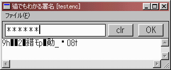 いつもとほとんど変わりません。// hash04.cpp #define _WIN32_WINNT 0x0500 #ifndef STRICT #define STRICT #endif #define ID_EDIT 100 #define ID_STATIC 101 #define ID_PASS 102 #define ID_BUTTON_CLR 103 #define ID_BUTTON_OK 104 #define STATIC_HEIGHT 35 #include <windows.h> #include <windowsx.h> #include <wincrypt.h> #include "resource.h" LRESULT CALLBACK WndProc(HWND, UINT, WPARAM, LPARAM); LRESULT CALLBACK MyStaticProc(HWND, UINT, WPARAM, LPARAM); ATOM InitApp(HINSTANCE); BOOL InitInstance(HINSTANCE, int); BOOL MySign(HWND, char *); BOOL MyVerify(HWND, char *); BOOL MySaveAs(HWND); BOOL MySave(HWND); BOOL MyOpen(HWND); void MyNew(HWND); //void IsSign(HWND); BOOL MyEncrypt(HWND); BOOL MyDecrypt(HWND hEdit); char szClassName[] = "hash04"; //ウィンドウクラス char szWinTitle[] = "猫でもわかる署名 [%s]"; HINSTANCE hInst; //元ファイル、プロッブファイル、署名ファイル char szOrgFile[MAX_PATH], szBlobFile[MAX_PATH], szSigFile[MAX_PATH]; //暗号化されたファイル、復号されたファイル char szEncFile[MAX_PATH], szDecFile[MAX_PATH]; //パスワード char szPass[64]; //署名検証をするかどうか BOOL bSig = TRUE; //元々のスタティックコントロールのプロシージャ WNDPROC OrgStaticProc; //スタティックコントロール上のエディットコントロール、ボタンのハンドル HWND hPass, hButOK, hButCLR; //表示用エディットコントロール HWND g_hEdit; //暗号化か復号か BOOL bEncrypt = TRUE; int WINAPI WinMain(HINSTANCE hCurInst, HINSTANCE hPrevInst, LPSTR lpsCmdLine, int nCmdShow) { MSG msg; hInst = hCurInst; if (!InitApp(hCurInst)) return FALSE; if (!InitInstance(hCurInst, nCmdShow)) return FALSE; while (GetMessage(&msg, NULL, 0, 0)) { TranslateMessage(&msg); DispatchMessage(&msg); } return msg.wParam; } //ウィンドウ・クラスの登録 ATOM InitApp(HINSTANCE hInst) { WNDCLASSEX wc; wc.cbSize = sizeof(WNDCLASSEX); wc.style = CS_HREDRAW | CS_VREDRAW; wc.lpfnWndProc = WndProc; //プロシージャ名 wc.cbClsExtra = 0; wc.cbWndExtra = 0; wc.hInstance = hInst;//インスタンス wc.hIcon = LoadIcon(NULL, IDI_APPLICATION); wc.hCursor = LoadCursor(NULL, IDC_ARROW); wc.hbrBackground = (HBRUSH)GetStockObject(WHITE_BRUSH); wc.lpszMenuName = "MYMENU"; //メニュー名 wc.lpszClassName = (LPCSTR)szClassName; wc.hIconSm = LoadIcon(NULL, IDI_APPLICATION); return (RegisterClassEx(&wc)); } //ウィンドウの生成 BOOL InitInstance(HINSTANCE hInst, int nCmdShow) { HWND hWnd; hWnd = CreateWindow(szClassName, "猫でもわかる署名", //タイトルバーにこの名前が表示されます WS_OVERLAPPEDWINDOW, //ウィンドウの種類 CW_USEDEFAULT, //X座標 CW_USEDEFAULT, //Y座標 420, //幅 260, //高さ NULL, //親ウィンドウのハンドル、親を作るときはNULL NULL, //メニューハンドル、クラスメニューを使うときはNULL hInst, //インスタンスハンドル NULL); if (!hWnd) return FALSE; ShowWindow(hWnd, nCmdShow); UpdateWindow(hWnd); return TRUE; }