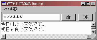 上書き保存をする関数です。メニューの「上書き保存」を選択したときは bSigがFALSEになっているので単なる上書き保存です。「署名をして上書き保存」 を選択した場合はbSigがTRUEになっているので署名をします。BOOL MySave(HWND hEdit) { int iLen; HGLOBAL hMem; char *lpszBuf, *p; int result; HANDLE hFile; DWORD dwWritten; if (strcmp(szOrgFile, "") == 0) { MessageBox(hEdit, "ファイル名がついていません", "Error", MB_OK); return FALSE; } iLen = GetWindowTextLength(hEdit); hMem = GlobalAlloc(GHND, iLen + 64); lpszBuf = (char *)GlobalLock(hMem); Edit_GetText(hEdit, lpszBuf, iLen + 64); hFile = CreateFile(szOrgFile, GENERIC_WRITE, FILE_SHARE_READ, NULL, CREATE_ALWAYS, FILE_ATTRIBUTE_NORMAL, NULL); if (hFile == INVALID_HANDLE_VALUE) { MessageBox(hEdit, "ファイをオープンできません", "Error", MB_OK); return FALSE; } WriteFile(hFile, lpszBuf, strlen(lpszBuf), &dwWritten, NULL); if (bSig) { strcpy(szBlobFile, szOrgFile); p = strrchr(szBlobFile, '.'); result = p - szBlobFile; szBlobFile[result + 1] = '\0'; strcat(szBlobFile, "key"); strcpy(szSigFile, szOrgFile); p = strrchr(szSigFile, '.'); result = p - szSigFile; szSigFile[result + 1] = '\0'; strcat(szSigFile, "sig"); MySign(hEdit, lpszBuf); } CloseHandle(hFile); GlobalUnlock(hMem); GlobalFree(hMem); SendMessage(hEdit, EM_SETMODIFY, (WPARAM)FALSE, 0); return TRUE; }