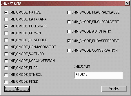 IMEをいろいろな変換状態にして入力モード、変換モードの値の組み合わせをメモしておいてください。