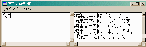 左のウィンドウで日本語を入力すると、右のウィンドウに刻々とIMEの状態が表示されます。